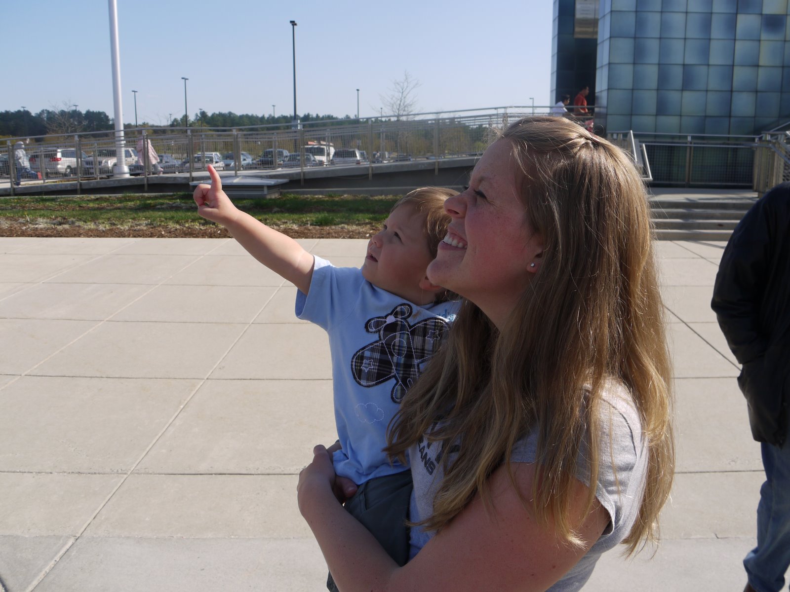 Nonna and Poppa and Daddy and I all went with Zachary to see the National Air and Space Museum's Steven F. Udvar-Hazy Center in Virginia. Zachary was happy to ride around in his stroller for the first part of our visit, even snoozing for a little while. Then he needed some air and space to run. He would run around, pointing up at the ceiling yelling, "Airplaaaaay...Fly!" When we went up to the observation tower, you could watch planes taking off from Dulles. Zachary would point to the plane the whole time it was in view, and as it disappeared, he said, "Buh-bye airplaaay!"